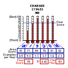 Not only are there fewer issue of assault on morality in Charade than in The Truth About Charlie, each issue of assault on morality that appears in both versions is much less extreme i the original than in the remake. One of the most graphic assaults in Charade is when Tex lights matches then throws them in Reggie's lap as a threat. There is no use of the three/four letter word vocabulary in Charade nor is there any use of the most foul of the foul words [Prov. 22:11]. God's name in vain is used but never with the four letter expletive [Deut. 5:11]. But not in the remake (that I can remember) is the use of a child as a tool to manipulate others. Sexually, Charade is featherweight compared to The Truth About Charlie. As always, the listing in the Findings/Scoring section reveals the ignominious content of a movie analyzed. Your comparison of this listing and the one for The Truth about Charlie (plus the scoring distribution which is driven by the content) should be at least interesting as a measure of the increase in ignominy between yesterday and today. Objectively and inarguably interesting.