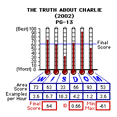 I suspect The Truth About Charlie is just one example of the degradation of morality in entertainment: that all of modern entertainment suffers the same disease. I can hear it now, "Hey! This is the 21st century! Get with the times!" After this comparative analysis using the same model, the same investigation standards, the same equations, even the same investigator using the same computer with the same computer program, why now do you think the "times" are the way they are?
